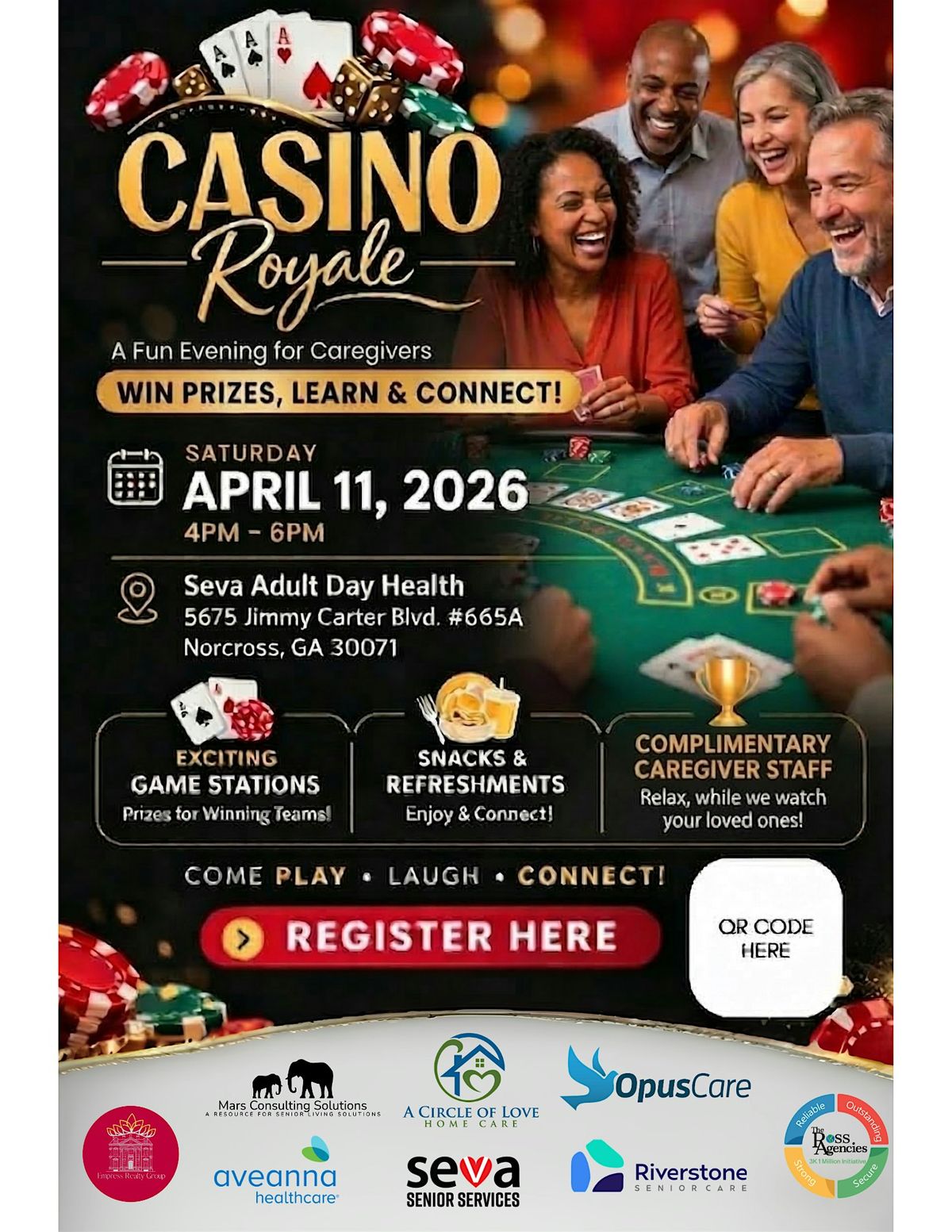 Join us for Casino Royale: A Fun Evening for Caregivers, hosted at Seva Adult Day Health. This isn't just another seminar—it’s an early evening designed specifically to give you the break you deserve while providing the tools you need to navigate your caregiving journey with confidence.