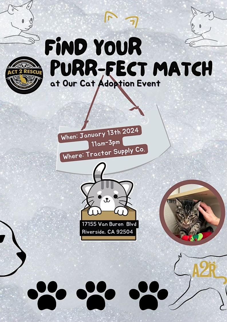 So mark your calendars for Saturday Jan 13, 2024 and join us at Tractor Supply Co. located at 17155 Van Buren Blvd. Riverside CA 92504. Come ready to fall in love with a furry companion and make a difference in a cat's life. We can't wait to see you there!