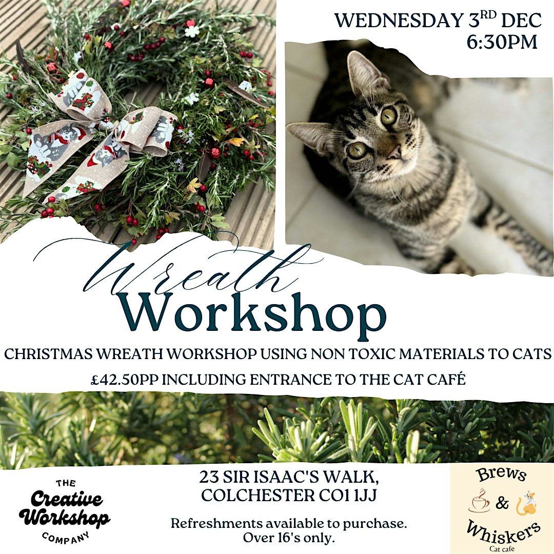 Join us on Wednesday 3rd December at 6:30pm at Brews & Whiskers, The Cat Café, 23 Sir Isaac’s Walk, Colchester CO1 1JJ for a truly unique and relaxing Christmas Wreath Workshop.