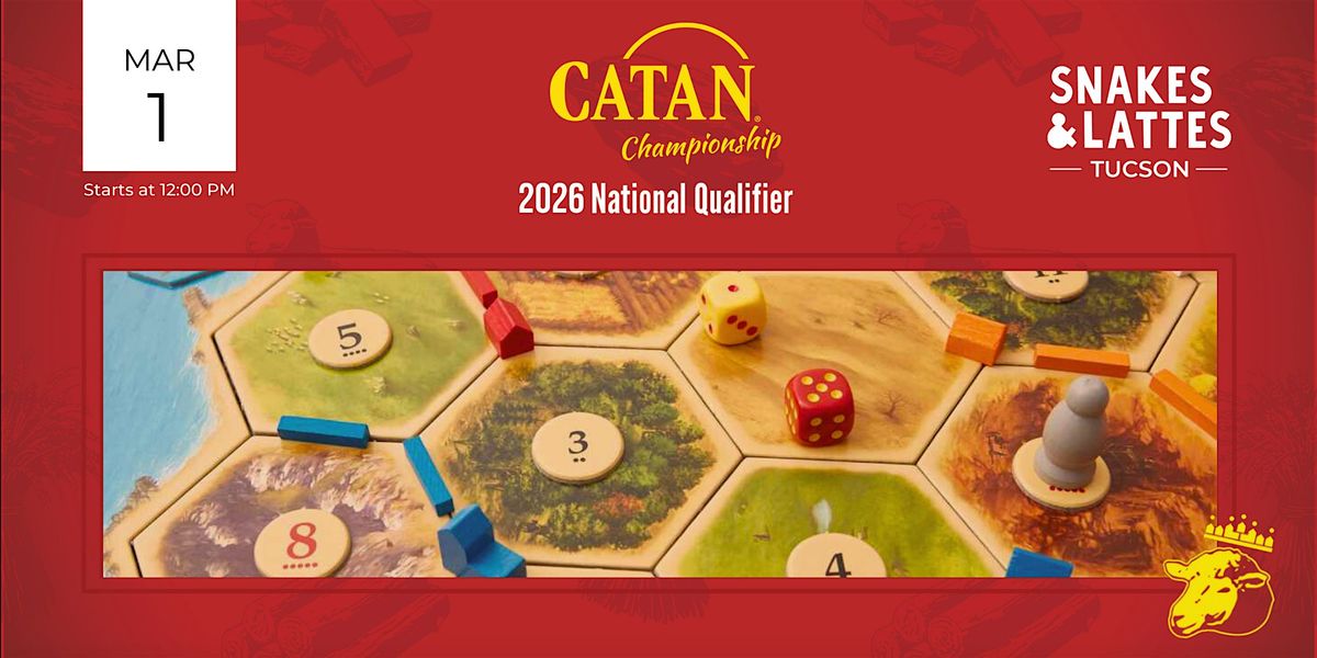 Show off your strategy and settle for greatness at the CATAN Championship Qualifier on March 1st at Snakes & Lattes Tucson! Build, trade, and conquer your way to victory as you compete against other top players for a chance to advance to the next stage. Whether you're a seasoned CATAN master or a rising star, this is your moment to shine.
