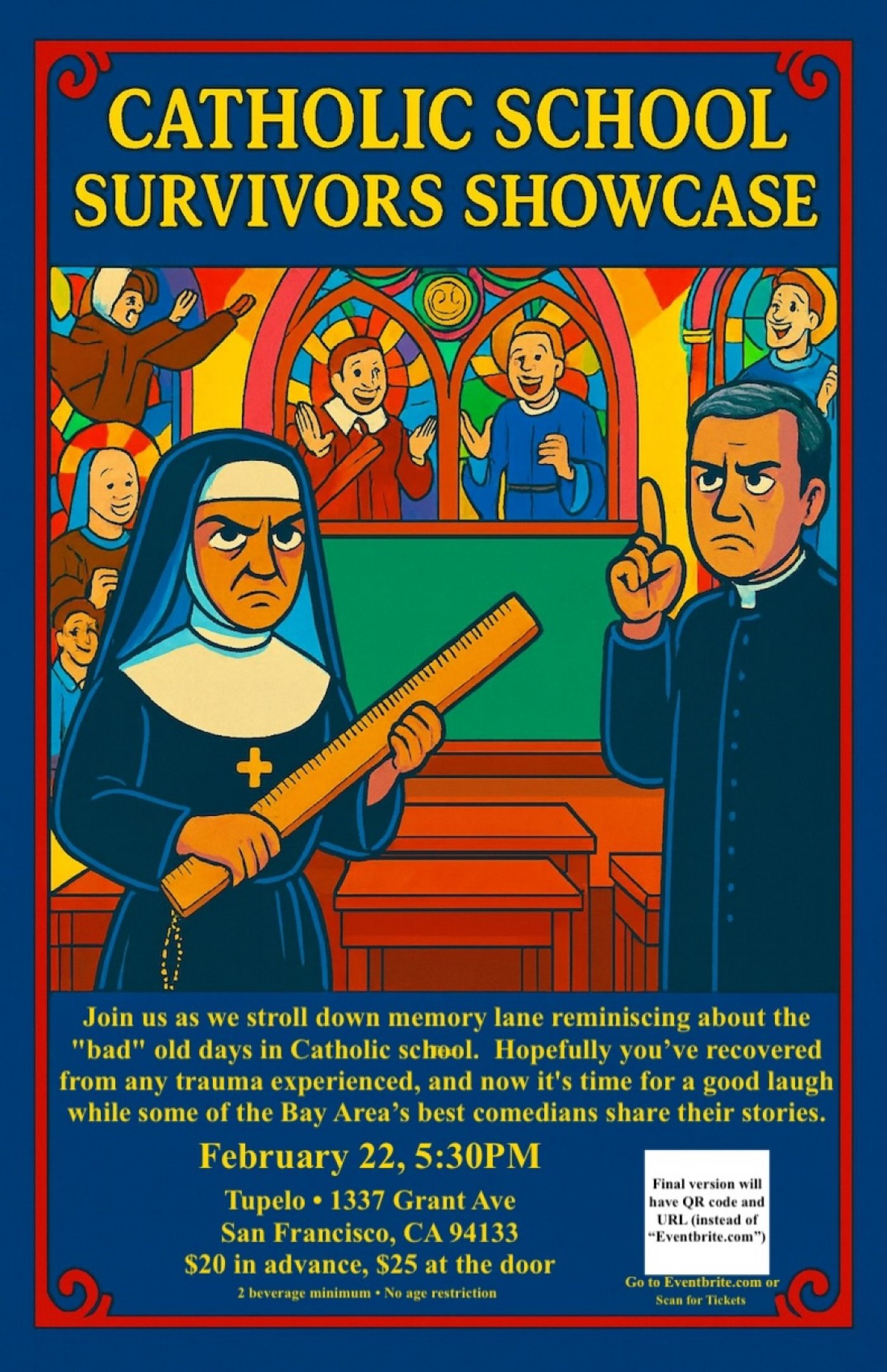 Join us as we stroll down memory lane reminiscing about the “bad” old days in Catholic school. Hopefully you have recovered from any trauma you experienced and now it’s time to enjoy a good laugh while some of the best Bay Area comedians share their stories.