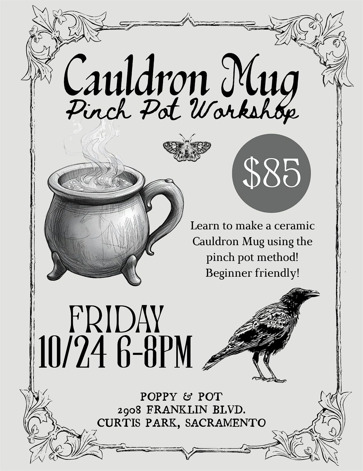 This workshop is taught by the Co-Owner and lead potter of Poppy + Pot, Kevin Reichenberg! At this spooky class, you’ll learn to make your very own Cauldron Mug using the pinch pot method! There will be a short demonstration then Kev will supervise as students are given black clay to make their very own mug and decorate it using various tools. *This workshop is for ages 13+