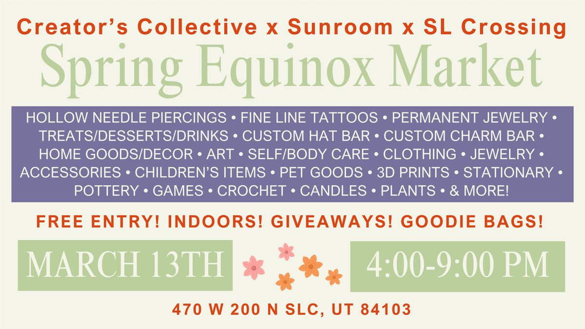 COME AND SHOP OUR SPRING EQUINOX MARKET in collaboration with Sunroom Coffee and Salt Lake Crossing! Our event is featuring vendors bringing you the best items including (but not limited to): clothing, handmade jewelry and silversmiths, accessories, 3d prints, pottery, art, home goods, crochet, and delicious beverages and pastries at Sunroom Coffee.
