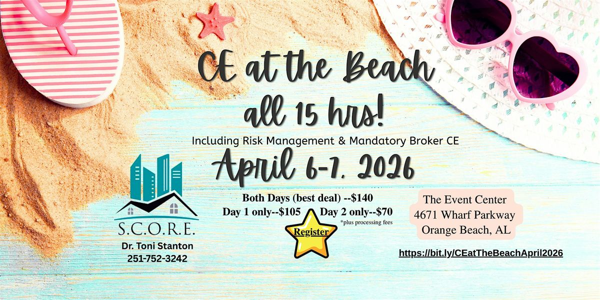 Get ready for CE at the Beach 2026....Back at The Event Center in Orange Beach! plenty of room! 🎉Whether you're here to get your CE out of the way or to soak up some inspiration from other real estate professionals, this is the place to be. Knock out your CE, then take an extra day or two to relax at the beach! Pack your sunscreen and good energy – see you at the Gulf!
