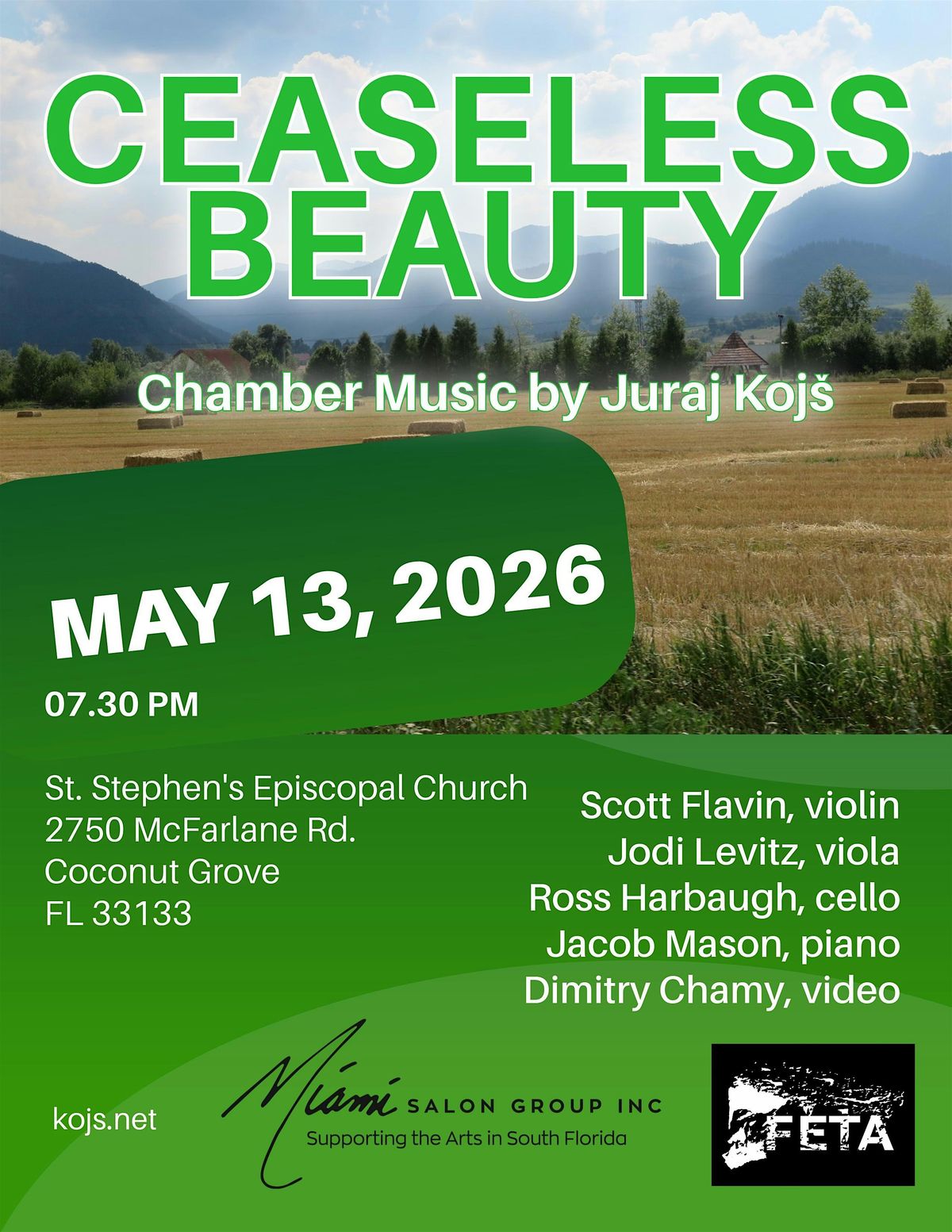 Ceaseless Beauty brings these worlds together in a program of lyrical, expansive works inspired by the landscape and cultural memory of Slovakia. Written for piano, strings, and piano quartet, the music unfolds with intensity, clarity, and emotional directness.