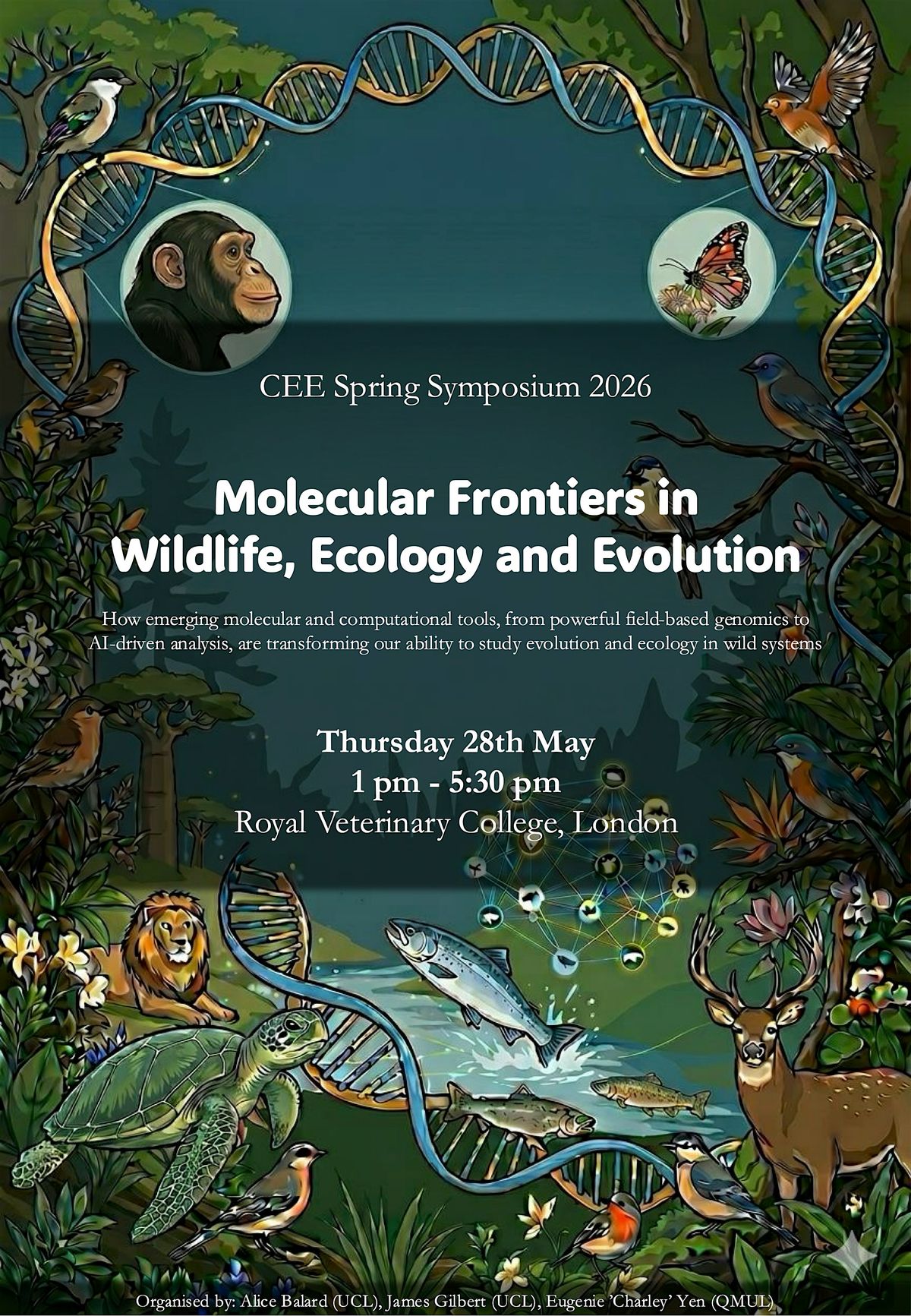 The title for the Symposium is 'Molecular Frontiers in Wildlife, Ecology and Evolution' and has been organised by Dr. Alice Balard (UCL), Dr. James Gilbert (UCL) and Dr. Eugenie 'Charley' Yen (QMUL).