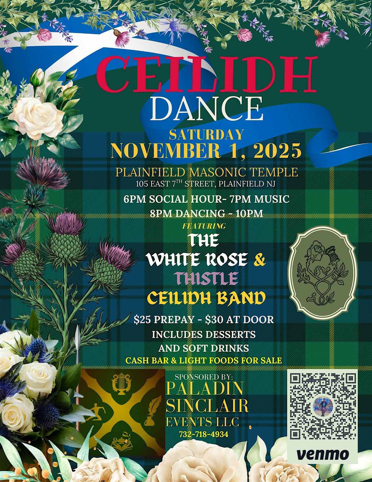 Ceilidh dance will be in the 2nd floor ballroom of the historic 1927 Masonic Temple in Plainfield, NJ and feature traditional music and foods of Scotland and the celtic regions. The White Rose & Thistle band will perform traditional dances and music throughout the evening, so come ready to dance and socialize. Wear the kilt or something from Celtia!