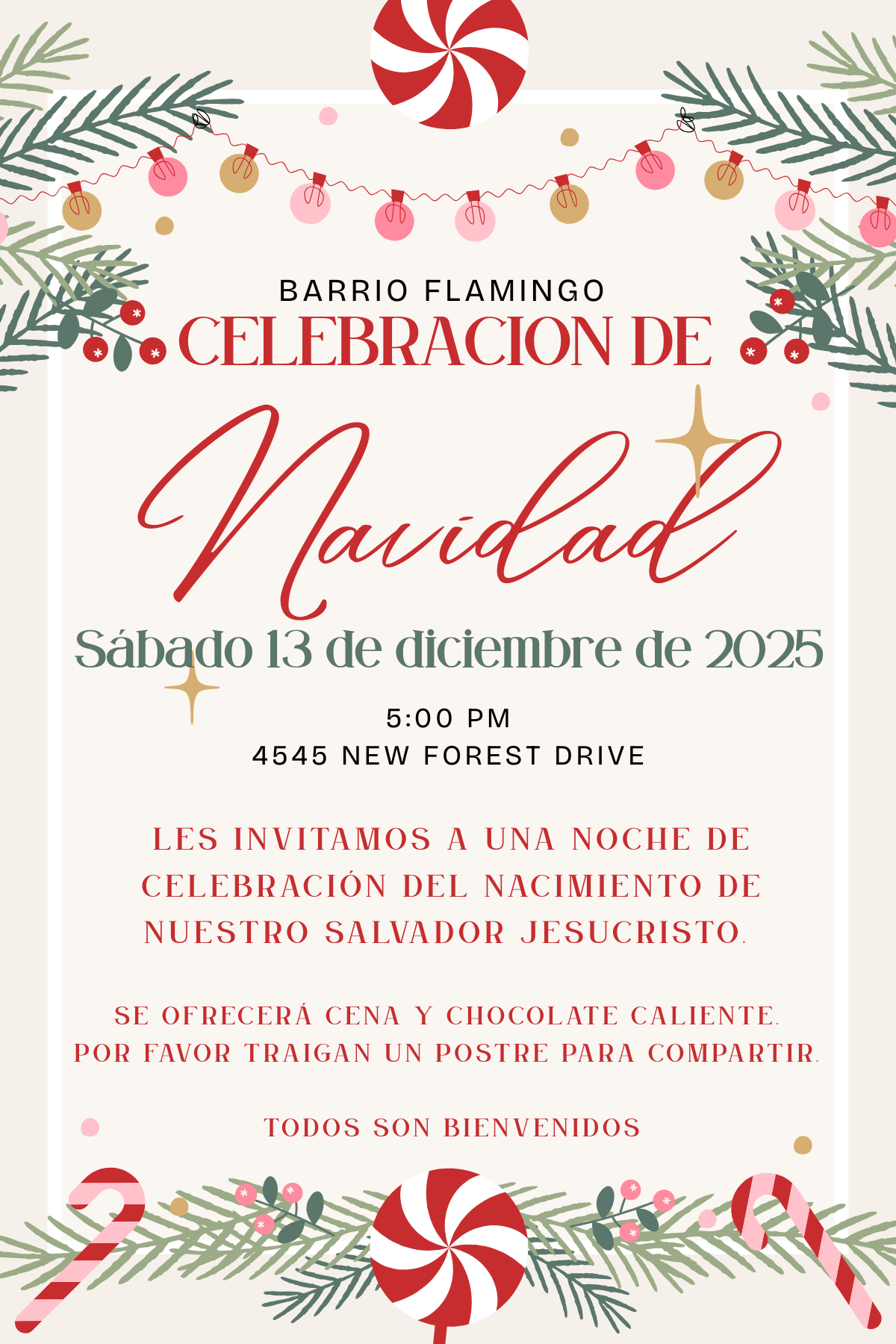 Celebracion por Navidad. Sabado 13 de diciembre a las 5:00pm Les invitamos a una noche de celebracion del nacimiento de nuestro Salvador Jesucristo. Se ofrecera cena y chocolate caliente. Todos estan invitados. '¡Únete a nosotros para celebrar con alegría!'