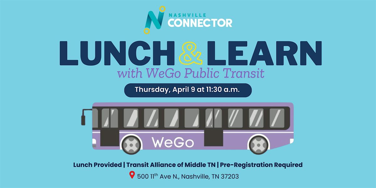 Welcome to the WeGo Public Transit Lunch & Learn! Join us for an informative session at the Transit Alliance of Middle Tennessee on Thursday, April 9, 2026 from 11:30 am - 1:00 pm. This in-person event hosted by the Nashville Connector will cover what you need to know about public transit in our community - attendees will learn about routes, schedules, etc. and the Nashville Connector will provide catered boxed lunches. Don't miss this opportunity to become a public transit pro.