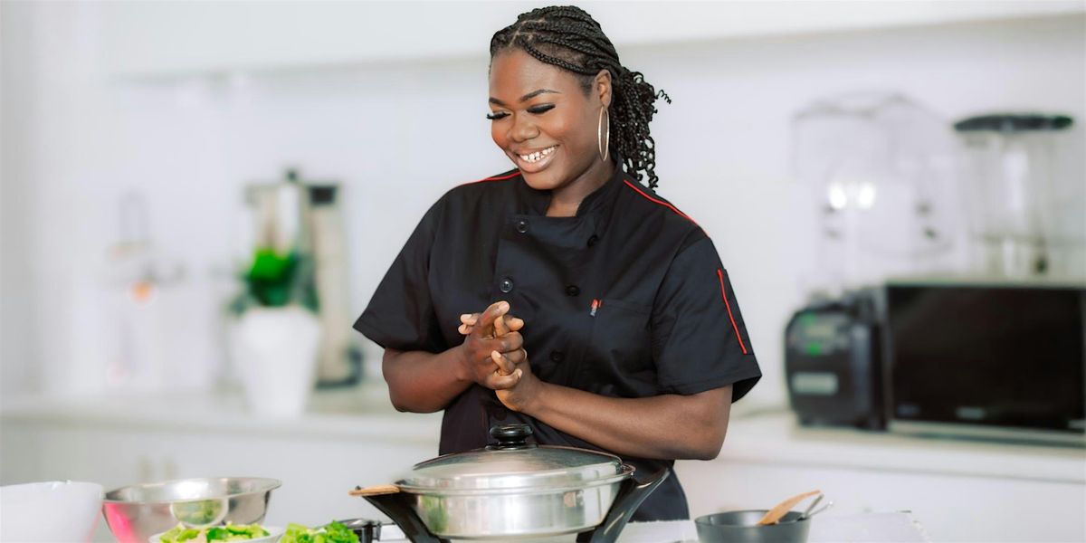 Image: Chef Evette Quoibia in a black chef jacket stands smiling at a kitchen bench covered with bowls and pot.