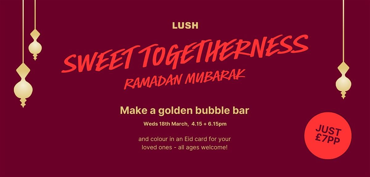 Join us at LUSH Spa Birmingham to celebrate Eid! Create your own shimmering, sweetly scented bath treat to take home — inspired by the spirit of celebration and self-care after a month of reflection. Make a wish, enjoy a complimentary hand and arm pamper on us, and take a moment to pause and indulge.