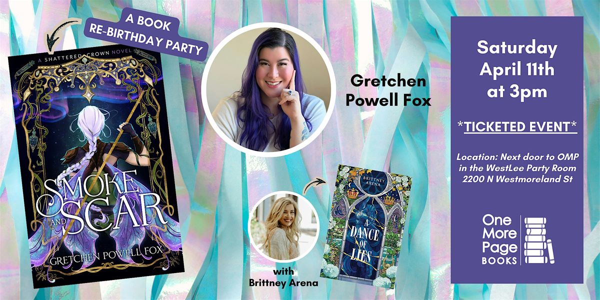 Celebrate the re-birth of SMOKE AND SCAR with its traditional publishing release and Gretchen's ACTUAL birthday! Gretchen will be in conversation with author Brittney Arena (A DANCE OF LIES). Join us to hear their discussion of SMOKE AND SCAR, and enjoy some tasty treats before the authors sign books! This is a ticketed event, and each ticket includes a copy of SMOKE AND SCAR in either paperback or hardcover.