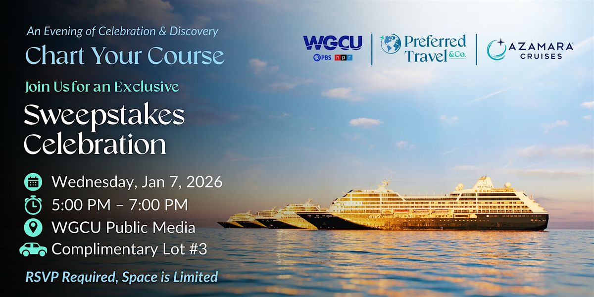 Hosted at the WGCU Public Media Center, this special evening brings together WGCU, Azamara, and Preferred Travel & Co. to celebrate partnership through travel. Guests will enjoy light refreshments and snacks while learning more about Azamara’s immersive approach to cruising, destination-focused itineraries, and thoughtfully elevated onboard experience.
