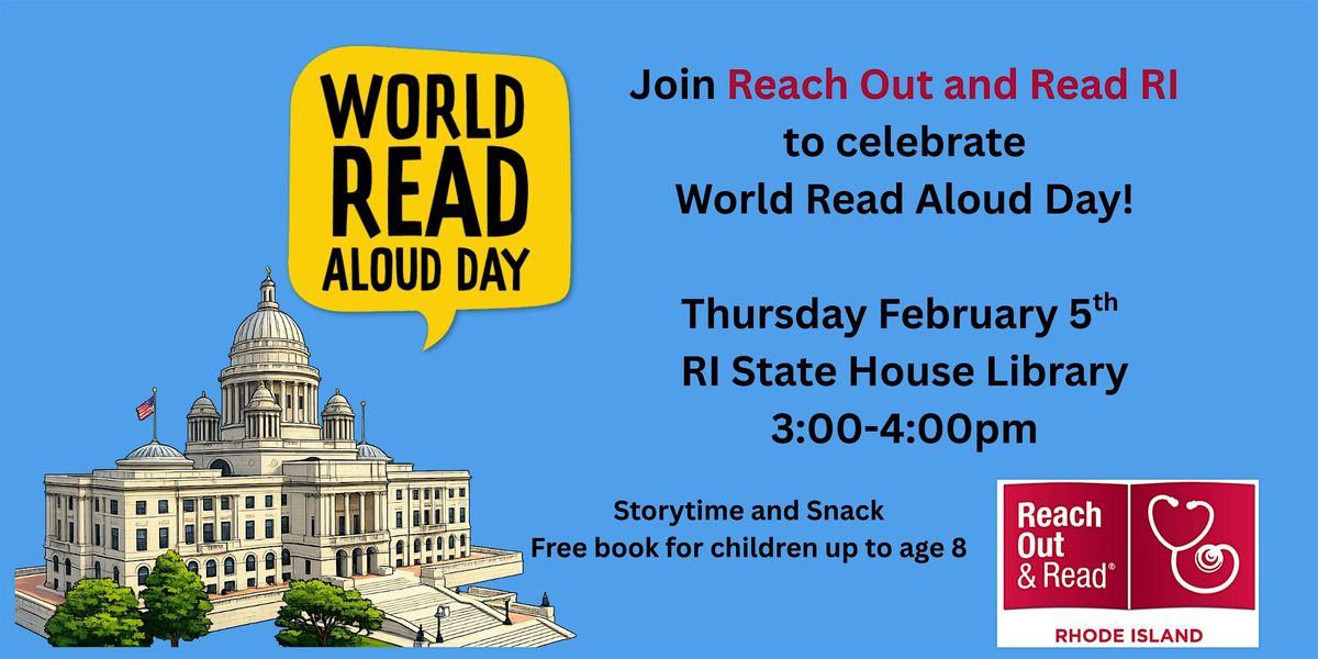 Reach Out and Read RI invites local families and legislators to join them to celebrate World Read Aloud Day. Stories will be read aloud throughout the hour, children can make a bookmark and small snacks will be available. Free books will be offered for children ages 8 and under.