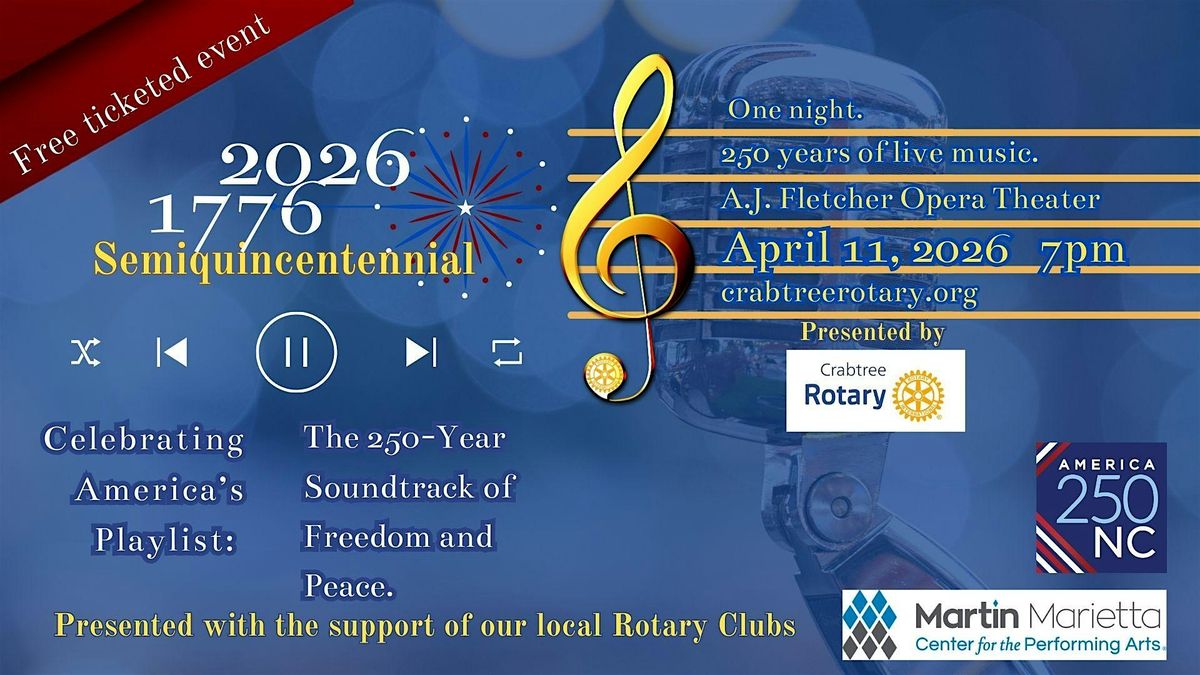This special event is offered as a gift to the community and is made possible in part through support from America 250 NC and the Martin Marietta Center for the Performing Arts. The concert is presented by Crabtree Rotary, with the participation of talented artists from the region, and the support of your local Rotary Clubs.
