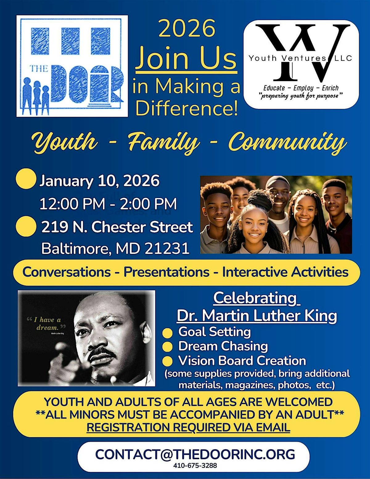 Come together at The Door (Baltimore Urban Leadership Foundation) on January 10, 2026 at 12:00 PM (Eastern Time) to honor the legacy of Dr. Martin Luther King, Jr. Let's reflect on his teachings and continue the fight for equality and justice. Don't miss this opportunity to be part of a meaningful event in our community!