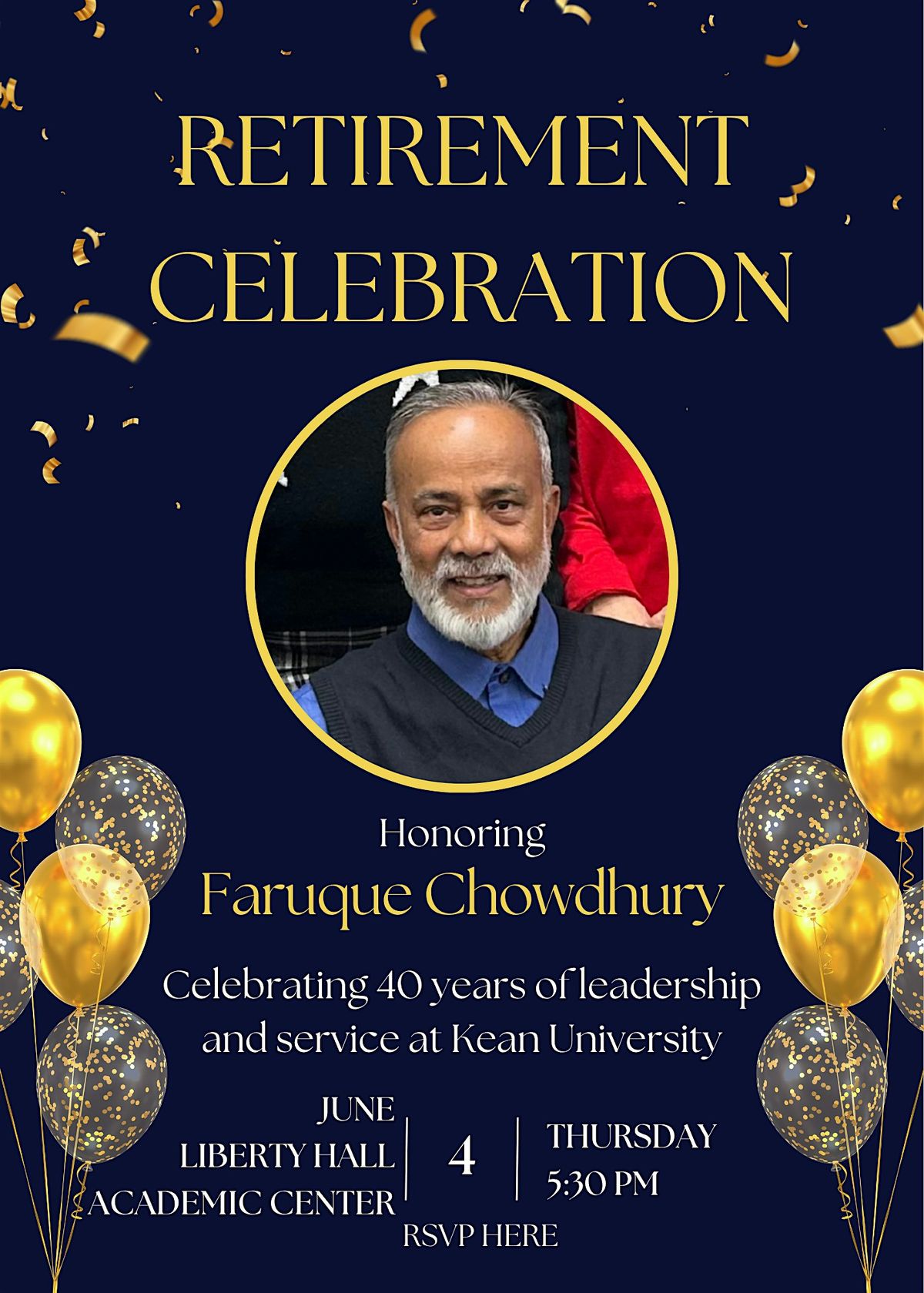 Join us to honor Faruque Chowdhury's inspiring journey of leadership and service at Kean!About this Event
