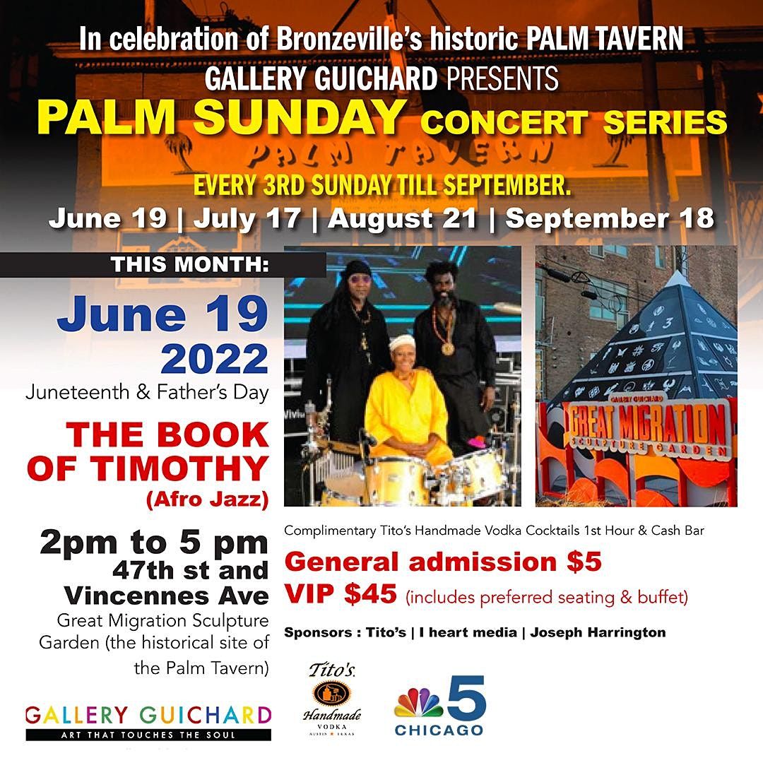 Palm Sunday Concert Series every third Sunday June to September in the Great Migration Garden in homage of the Historic Palm Tavern. Located at Gallery Guichard each third Friday between June and September 2 pm to 5 pm. General Admission $10; VIP (limited Seating) $45