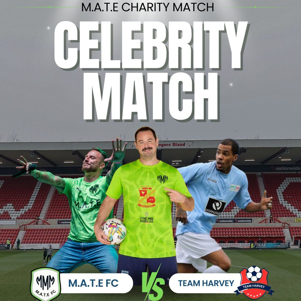 M.A.T.E charity footy match at Swindon's County Ground. Celebs vs Ex-Pros to raise money for men's mental health charity.