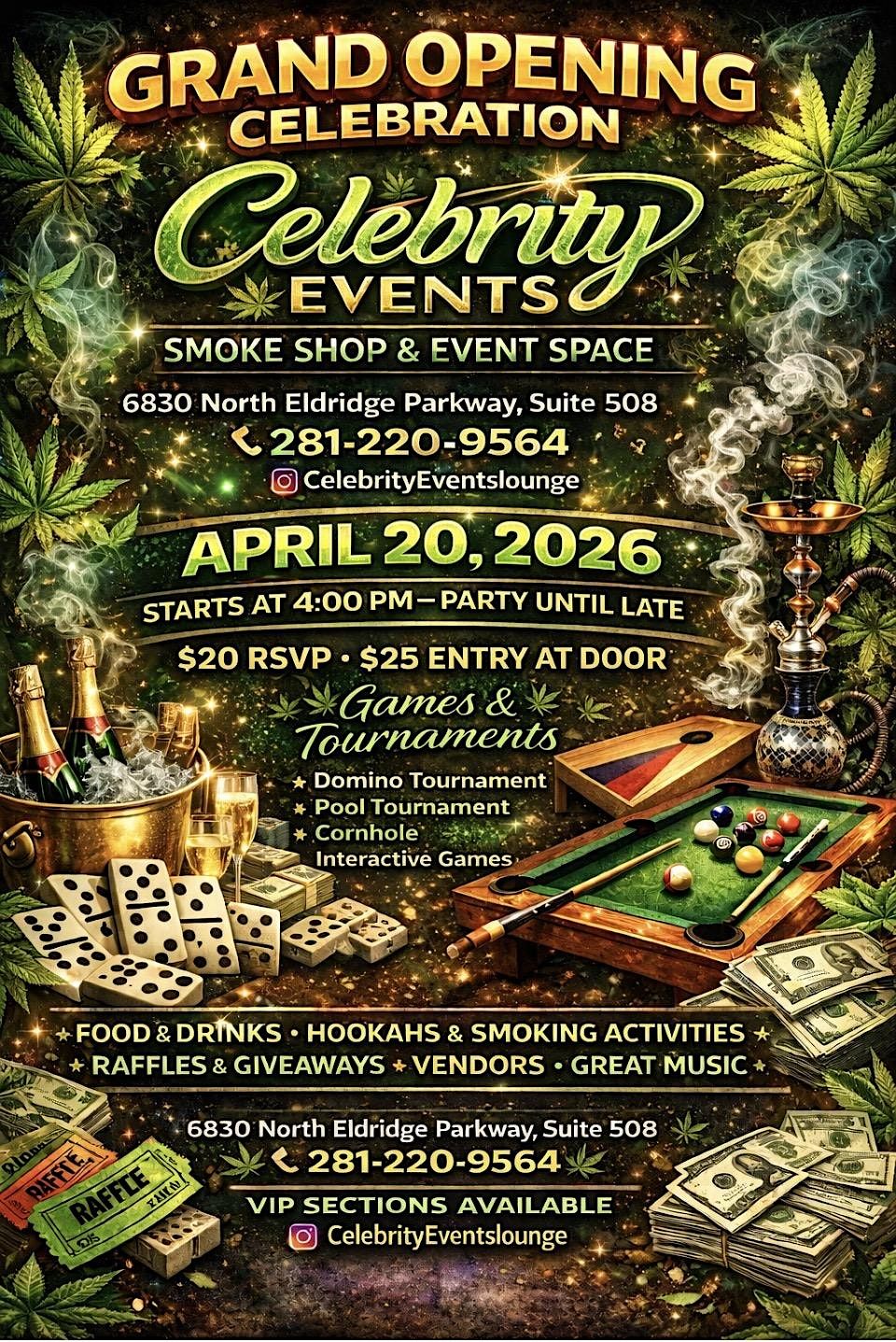 Join us for the Celebrity Events 420 Grand Opening Party – There will be food, drinks, games, Live DJ, giveaways, and great vibes.About this Event