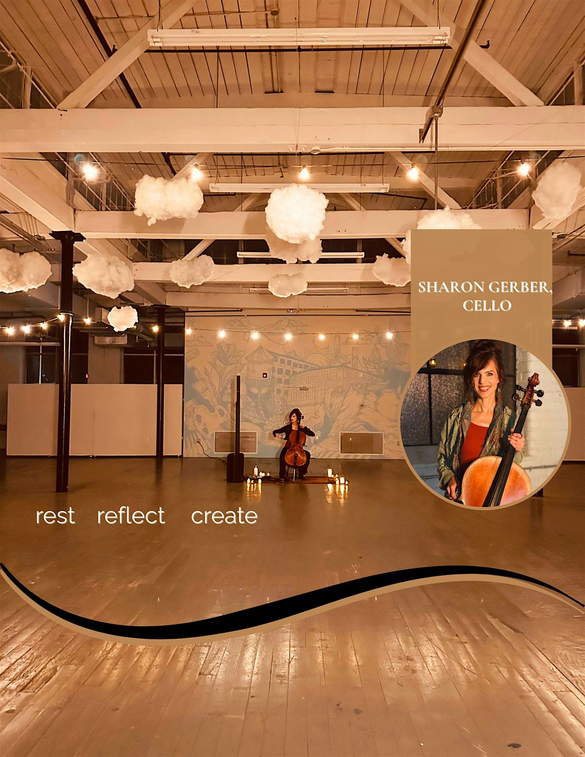 Bring a yoga mat to rest, or a journal, sketchbook, or creative project to work on quietly as the sound of the cello creates a spacious comforting atmosphere - an oasis for your spirit.
