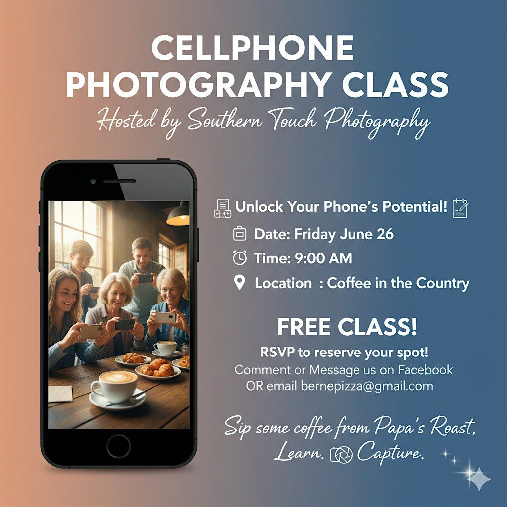 Want to take better photos with your phone? Join Southern Touch Photography for a fun, hands-on Cellphone Photography Class designed to help you capture beautiful, high-quality photos using just your cellphone. Learn simple tips and techniques for lighting, composition, editing, and camera settings that will instantly elevate your photos — perfect for everyday moments, family memories, social media, and more!