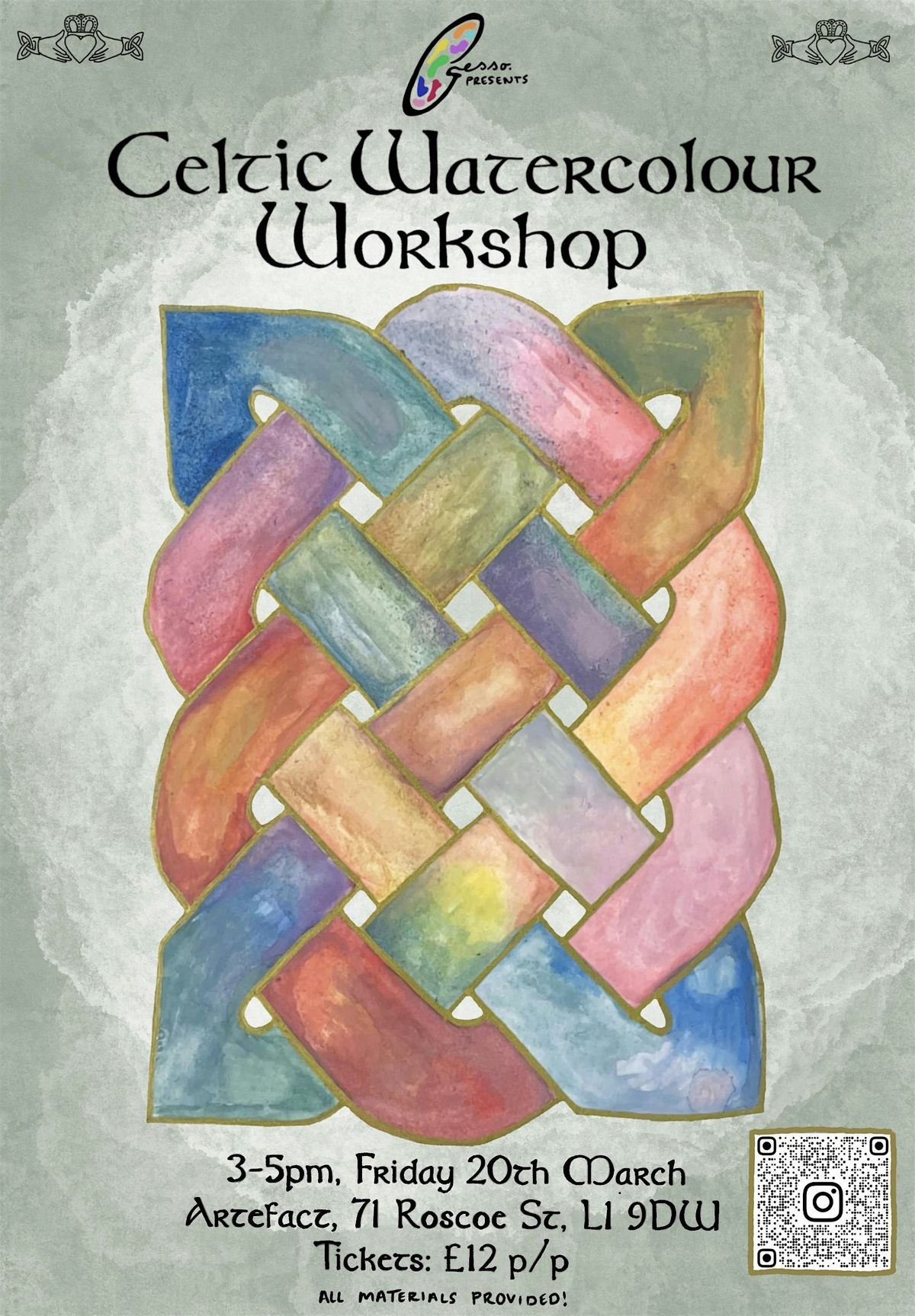 Join Gesso Artistry Events for a watercolour workshop, together creating vibrant pieces inspired by Irish Cletic art and design in honour of Saint Patrick's Day.