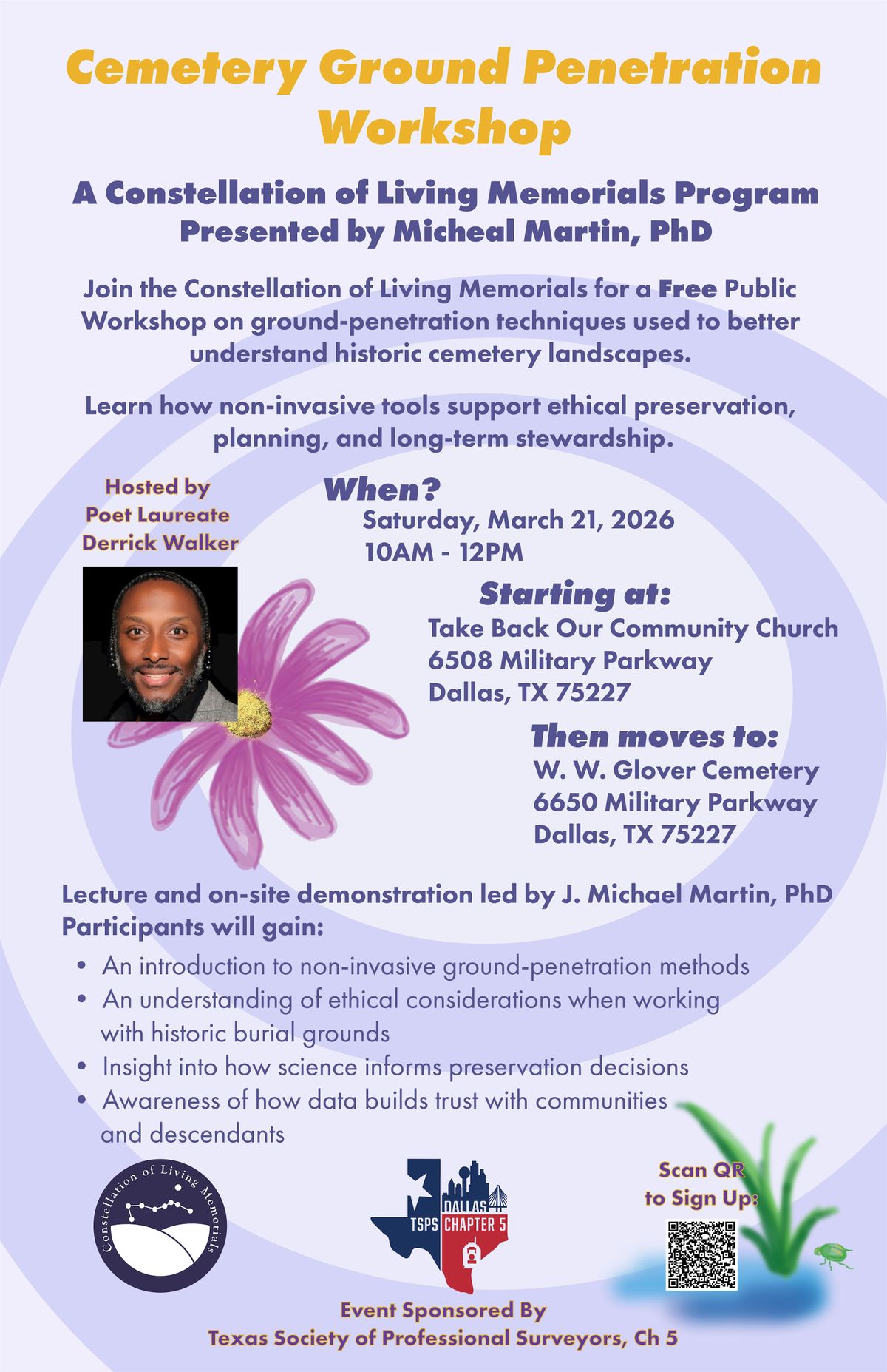 This public educational workshop introduces ground penetrating radar (GPR) techniques used to identify subsurface conditions and locate unmarked graves in historic cemeteries. Led by Dr. Michael Martin, PhD, the session blends science, ethics, and community stewardship to demonstrate how data-driven tools support respectful preservation and planning.