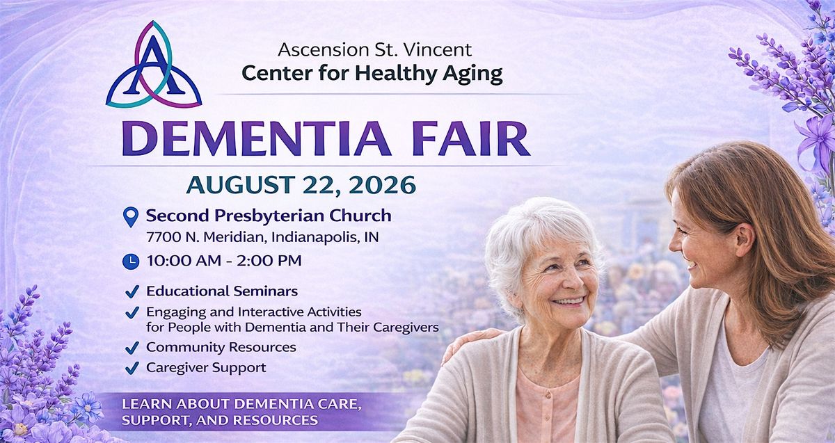 Come join us at the Center for Healthy Aging Dementia Fair! This event will be held at the Second Presbyterian Church on August 22, 2026 at 10:00 AM. Enjoy a welcoming day of education, support and fun for people living with dementia and their families/caregivers. Experience engaging, interactive activities designed to inspire connection, and learn from expert-led sessions offering practical guidance and resources.