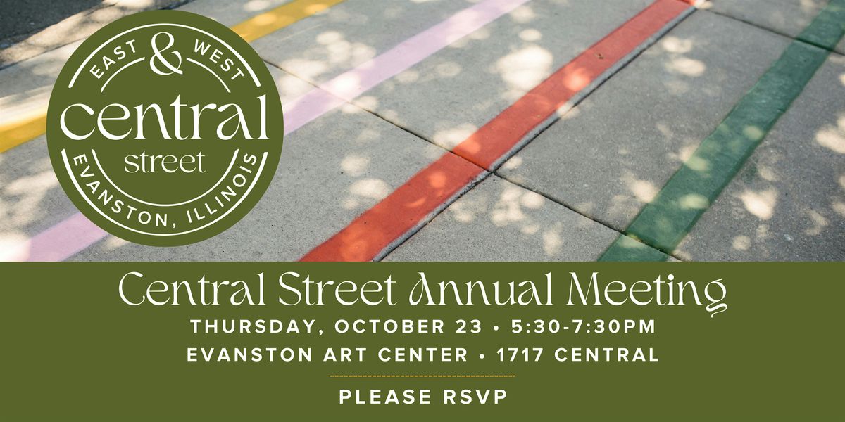 Reserve your free space for Central Street Evanston's Annual Meeting. Please join the Central Street Evanston Board of Directors for our Annual Meeting. We’ll talk about past year highlights, enjoy a sneak peek of what's to come, and share a toast to another great year. Come mingle with other businesses and meet the Central Street Board of Directors. Snacks and beverages. Seating is limited. Contact angela@centralstreet-evanston for any questions.