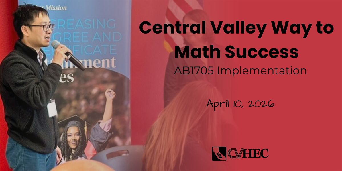 This April 10th math gathering will continue to focus on the Central Valley Way to Math Success. Math professors will be giving updates on AB1705 implementation, that started in fall 2025.