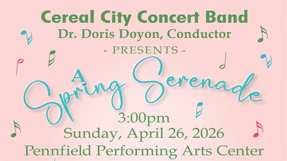 The Cereal City Concert Band invites the community to celebrate the season with "Spring Serenade", a lively and engaging concert to be held on Sunday, April 26th at Pennfield Performing Arts Center, 8299 Pennfield Rd, Battle Creek, beginning at 3:00pm