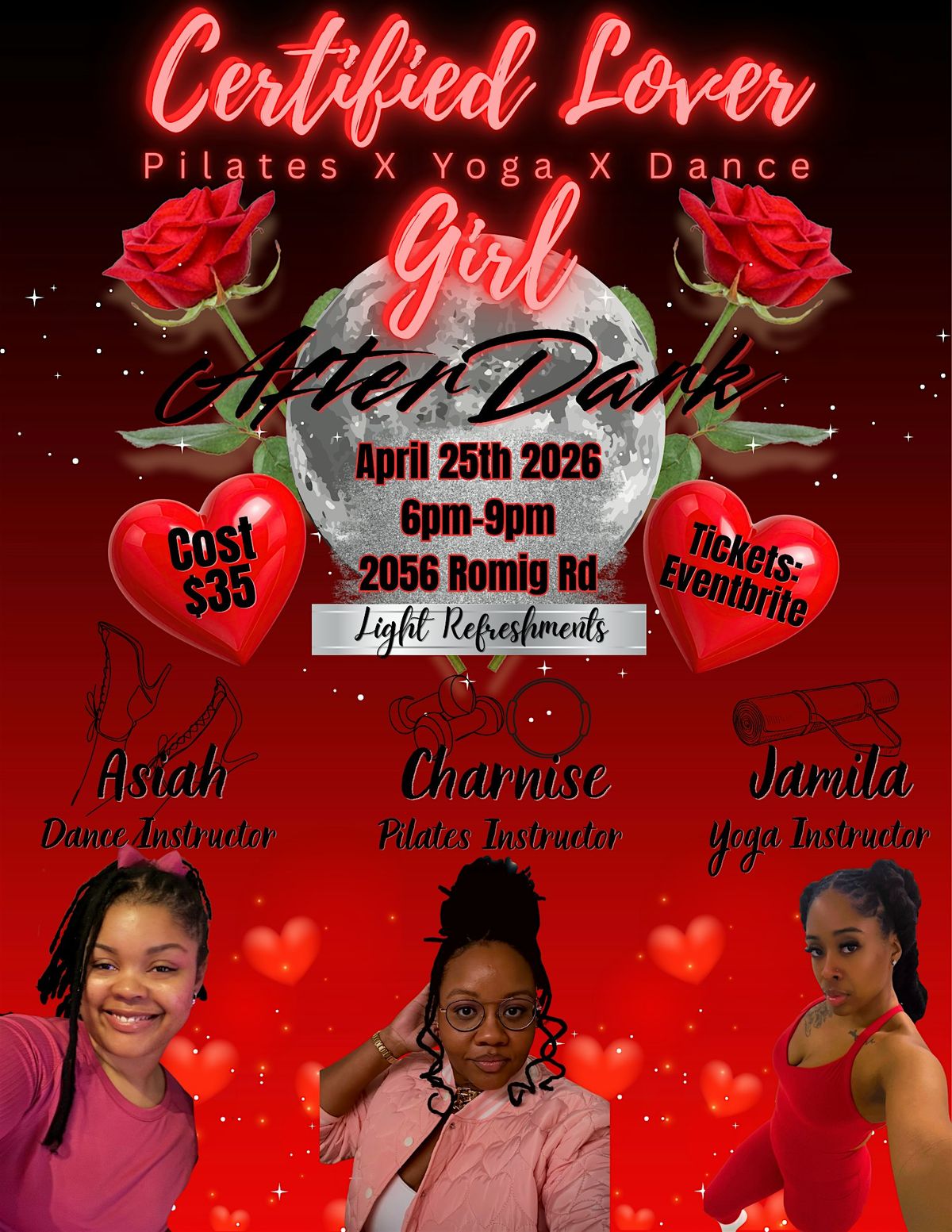 Come out and enjoy a special curated experience for the Certified Lover Girl AFTER DARK EDITION. Come ready to do yoga Pilates and a little dance. Light refreshments will be served
