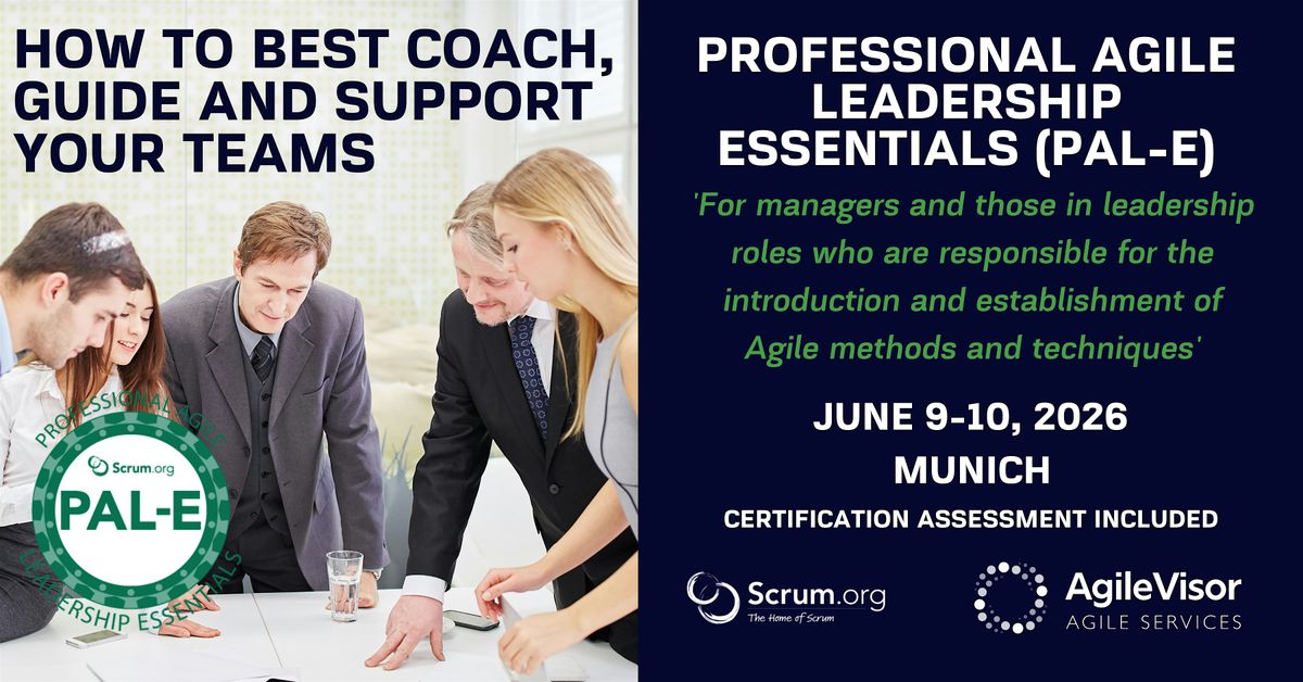 The Professional Agile Leadership Essentials (PAL-E) is a 2-day hands-on workshop that uses a combination of instruction and hands-on exercises to help managers and other leaders who work directly with agile teams understand how to best support, guide, and coach their teams to improve their agile capabilities.