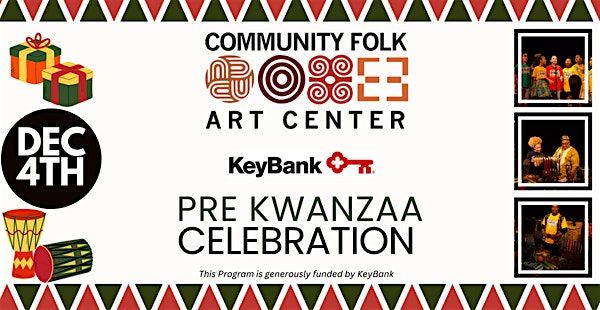 The Community Folk Art Center (CFAC) invites you to join us for our annual Pre-Kwanzaa Celebration event in the Black Box Theater on Thursday, December 4th, at 6:00 PM. Doors will open at 6:00 PM. During a night of fun, community, and live performances, we reflect on the 7 principles of Kwanzaa and how we can utilize them in our everyday lives. Special performances include African Drumming, a holiday medley by the Creative Arts Academy, and other surprise performances. This event is free and open to the public. Refreshments will be provided. Thank you to our sponsor KeyBank for generously funding this program.