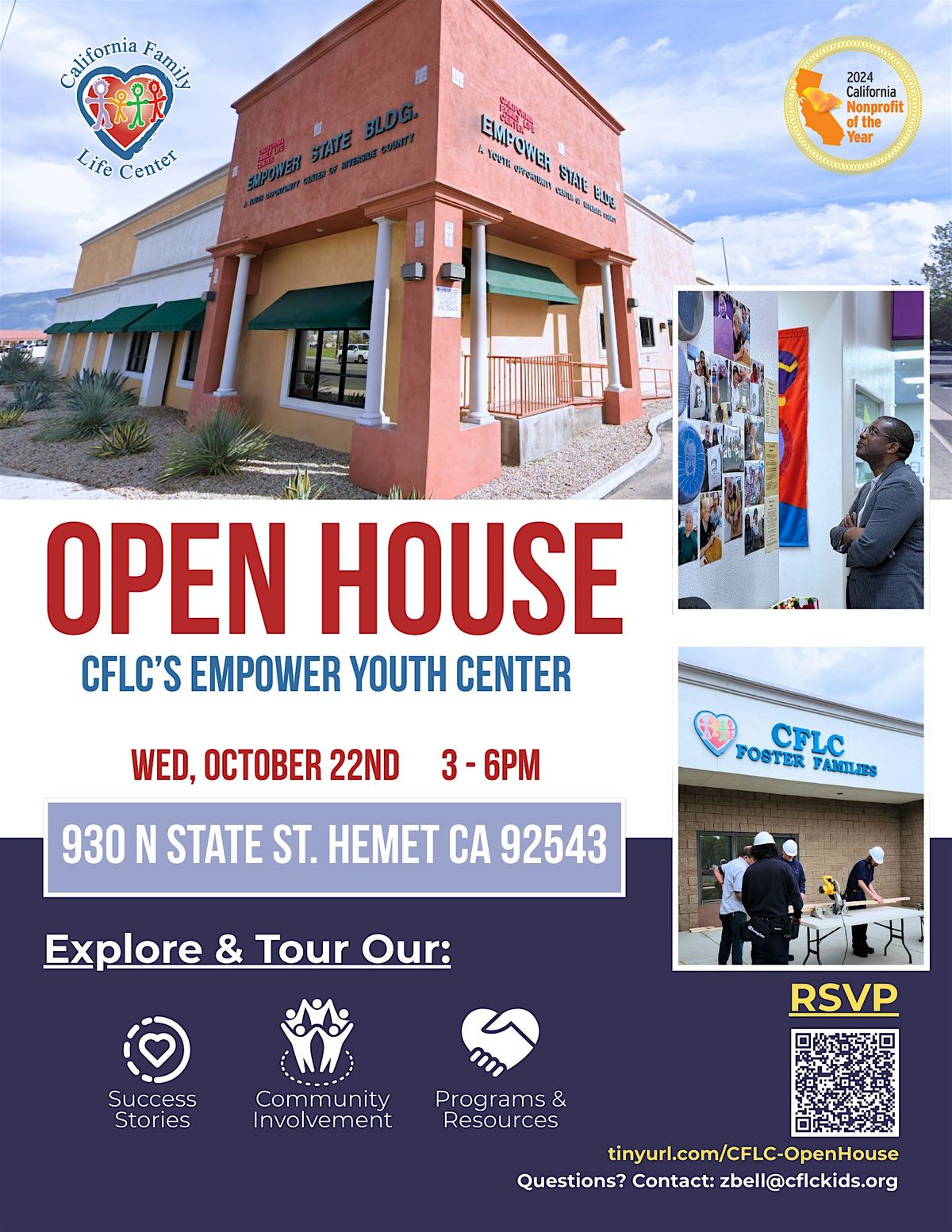 We invite you to our Hemet Youth Opportunity Center for an Open House gathering that highlights the work California Family Life Center is doing to create lasting change in our community. This event is an opportunity to connect with our board members, advisory board, partners, donors, friends, and supporters—both longtime and new—as we reflect on the progress we’ve made together.