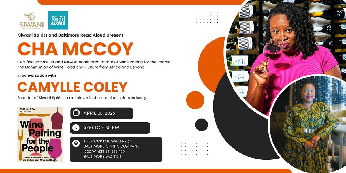 Presented by Siwani Spirits and Baltimore Read Aloud, this special event features a dynamic conversation with Cha McCoy, a certified sommelier and NAACP Image Award–nominated author of Wine Pairing for the People: The Communion of Wine, Food and Culture from Africa and Beyond.