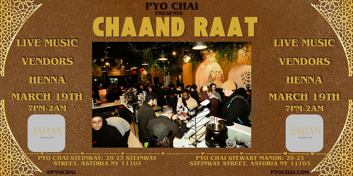 Come join us for a fun evening celebrating Chaand Raat at PYO Chai! It's happening on March 19, 2026 at 7:00 PM (ET). Enjoy great vibes, tasty chai, and good company as we soak in the festive spirit together. We will be having amazing vendors like Jahaan Fragrances, Henna Artists, and Live Music Performances!