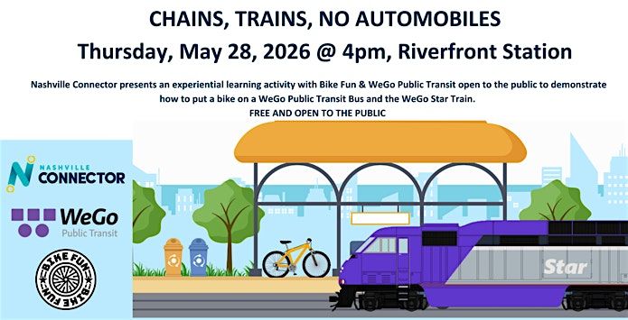 Meet NashConnector, WeGo Public Transit and Bike Fun reps. at Riverfront Station on Thursday, May 28th between 4 and 6pm before the WeGo Star departs. We will teach you hands-on how to board a bus or the train with your bike so you can use transit to expand the range of your bike commute, and ride to the park you love across town!