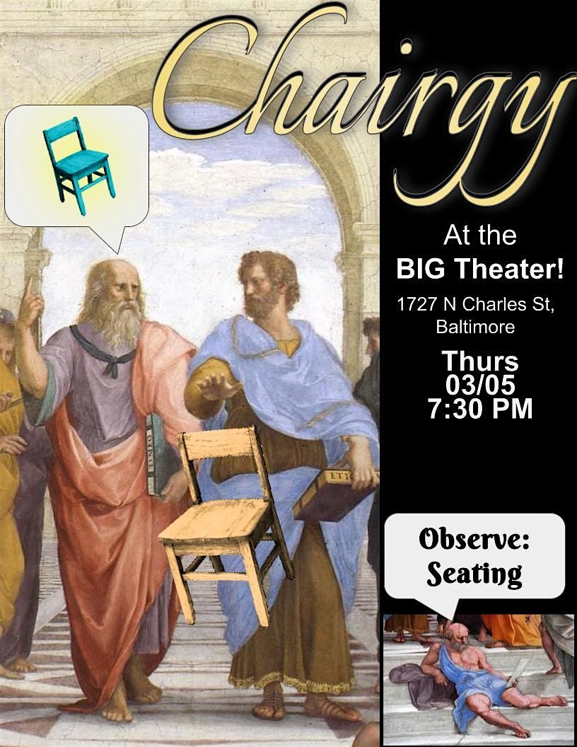What wonders can the chair provide you at Chairgy? Get ready for an unforgettable show as Chairgy Returns to BIG! Join us at Baltimore Improv Group (BIG) on March 5, 2026 at 7:30 PM (Eastern Time). Don't miss out on this evening as we plunge into exaltation! Come, behold the Chair!