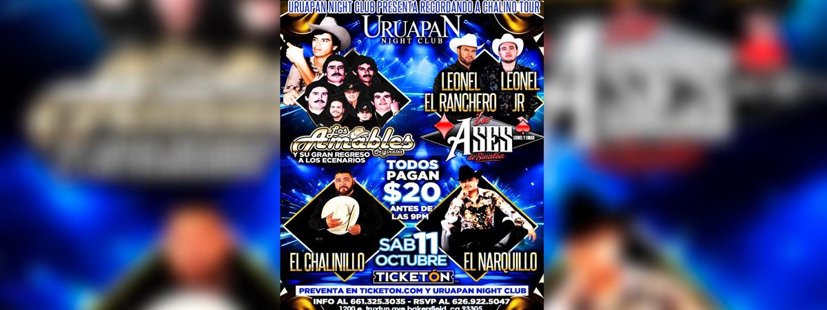 Don't miss CHALINO TOUR-LOS AMABLES, LOS ASES DE SINALOA & MAS happening at Uruapan Night Club, Bakersfield, CA, United States on 2025-10-11T20:00:00-08:00. A great evening with good music and a laid-back atmosphere awaits you. Invite your friends for a night out! **Event Details:** * **Location:** Uruapan Night Club, Bakersfield, CA, United States Claim your ticket to be at the forefront of exciting innovation. #CHALINOTOUR-LOSAMABLES,LOSASESDESINALOA&MAS #event #exciting #BakersfieldEvents #CAEvents