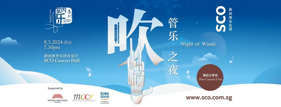The rich repertoire of musical possibilities available to Chinese wind instruments results in their dazzling variety of moods, techniques, and timbres. In "Night of Wind", the third concert in the Chamber Charms series, the audience can look forward to enjoying xun solo and suona quartet pieces, which are rarely performed at concerts. Furthermore, there will also be a xiao rendition of the well-known Western classic The Swan, curated by SCO Section Leader (Winds and Percussion) and Dizi Principal, Yin Zhiyang . The fusion of East and West promises a lively and rejuvenating evening! 华族吹管乐丰富多彩的气息、技巧与音色等变化,令人目不暇接。华乐团的“室内乐系列”第三场“吹管乐之夜”,乐团笛子首席兼吹打乐声部长尹志阳为您精挑细选了多首独特的作品,其中埙独奏和唢呐四重奏都是舞台上少见的,更有以东方传统乐器箫演奏脍炙人口的西方经典《天鹅》。东西交融,气韵生动,沁人心田。