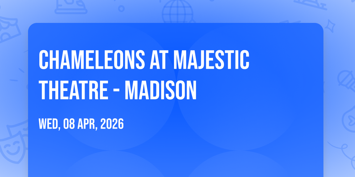 π Step into a world of wonder at Chameleons at Majestic Theatre - Madison, where extraordinary moments await! ποΈ Located at Majestic Theatre - Madison in dynamic Madison, WI, this event will become the talk of the town. π Join us on April 8th, 2026 at 08:00 PM for a celebration that defies the ordinary. β¨ This curated experience brings together the best of entertainment, culture, and community spirit. Every detail has been thoughtfully planned to ensure an unforgettable experience for all our guests. π― Take advantage of this opportunity to be part of something special. π Early registration is recommended as space is limited!