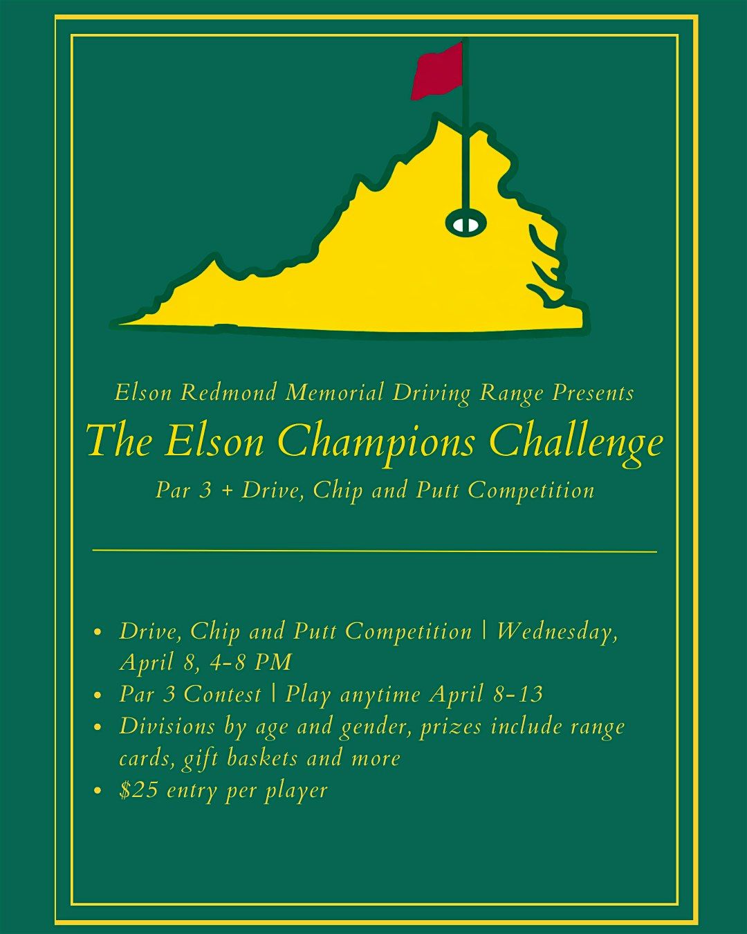 Drive, Chip and Putt contest will take place from 4pm-8pm on Wednesday, April 8th.The par 3 portion can be played anytime from April 8th - 13th. We'll have Masters themed food and drinks. $25 entry per person. Prizes will be awarded to winners in each division. Divisions by age and gender.