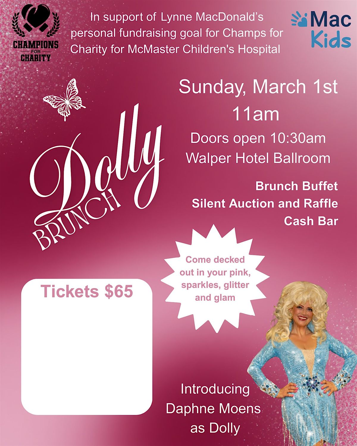 Only $65 - gets you a performance by one of Canada's top Dolly impersonators, an incredible brunch buffet from the Walper hotel. there are door prizes and raffle prizes. AND this is all for an incredible cause. All proceeds go to Champs For Charity Mac Kids ❤️❤️❤️McMaster childrens hospital.
