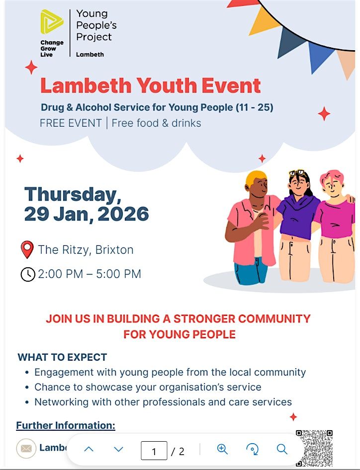 Get ready to connect, learn, and have fun at this awesome in-person event for Young People and Social/Health Care Professionals in Lambeth. It's the perfect chance to network with other services, discover opportunities, access different supports available in Lambeth, talk to professionals in person, and be part of something exciting.