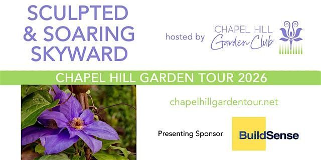 Celebrate Spring! Chapel Hill Garden Club’s popular Garden Tour returns April 25 & 26, 2026. “Sculpted & Soaring Skyward” offers an exclusive, self-guided tour of five of the area’s finest private gardens plus three public gardens affiliated with UNC.