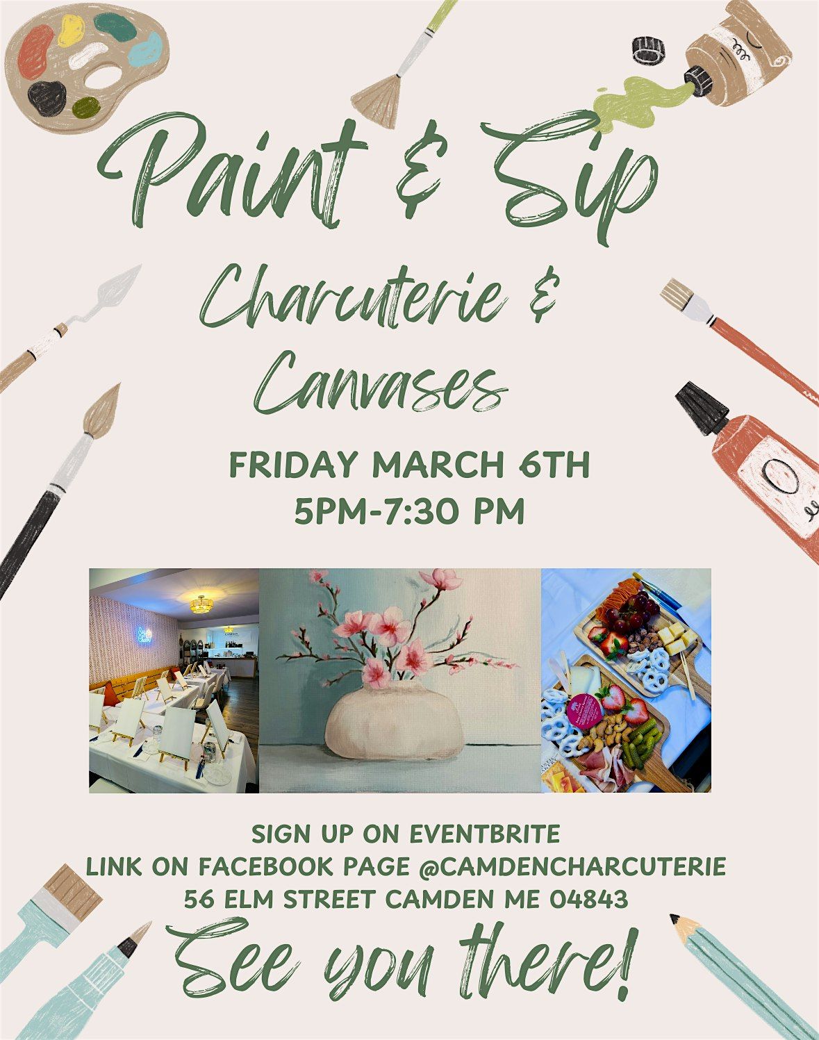 Join us at Camden Charcuterie on Friday February 6th for a fun-filled evening of creativity and delicious bites! Our talented instructor, local artist Alexa Michelle will guide you every step of the way, ensuring you leave with a work of art you'll be proud of. Don't worry about your painting skills - this event is all about having a good time and trying something new. So grab a friend or come solo, and get ready for a night of laughter, creativity, and of course, charcuterie!
