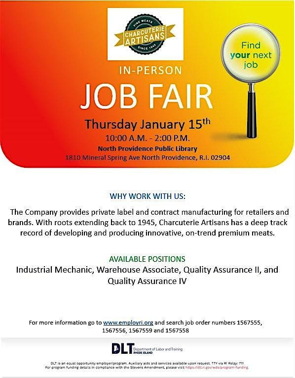 Charcuterie Artisans, a leader in private label and contract manufacturing since 1945, is hosting a job fair to fill multiple open positions. We are currently hiring Industrial Mechanics, Warehouse Associates, Quality Assurance II, and Quality Assurance IV roles. Join us to learn more about the company, available opportunities, and how you can become part of a team known for producing innovative, premium meat products for top retailers and brands. The event will take place on Thursday, January 15th from 10:00 A.M. to 2:00 P.M. at the North Providence Public Library, located at 1810 Mineral Spring Avenue, North Providence, RI.