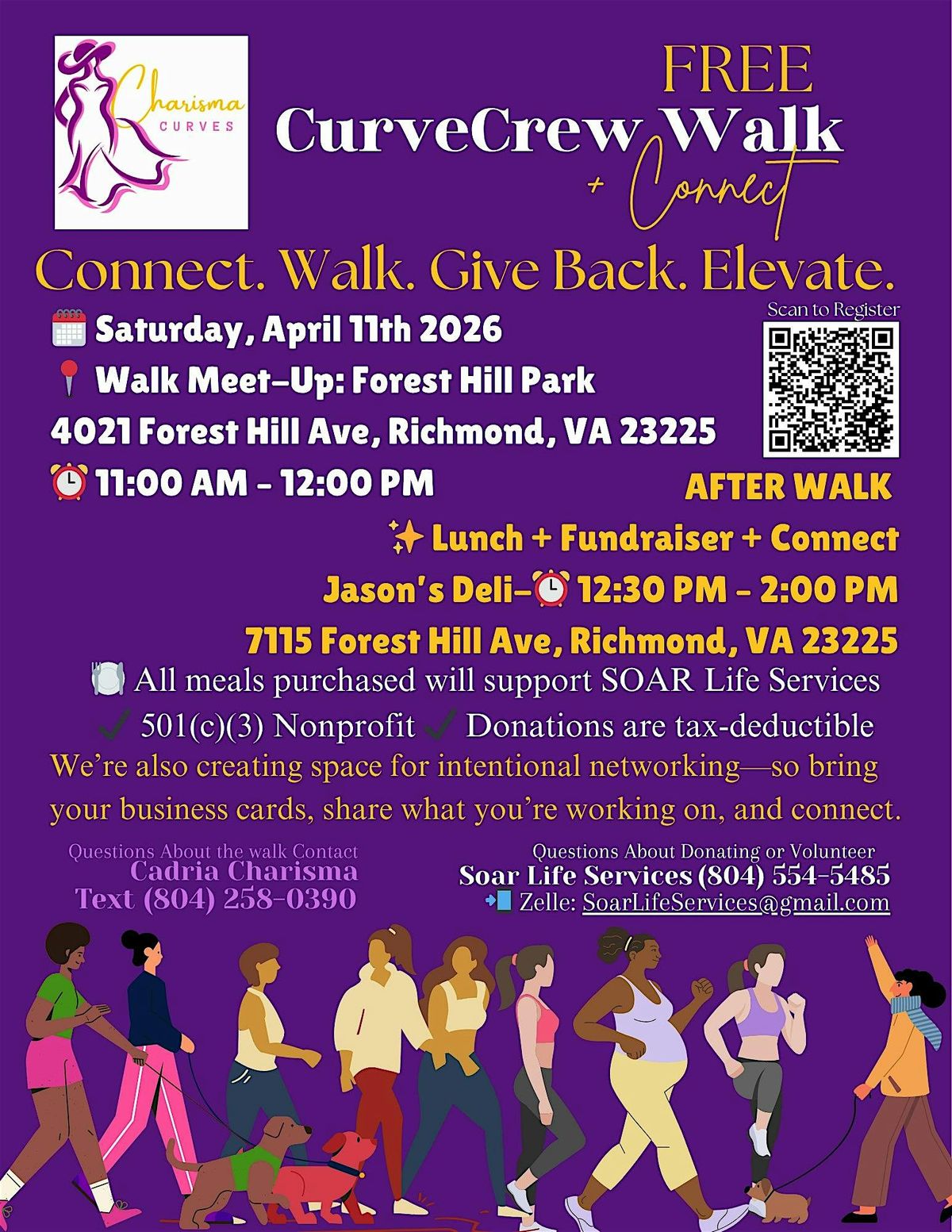 Led by Cadria Charisma, Founder of Charisma Curves and Vice President of SOAR Life Services, this free women’s walk creates a space for motivation, meaningful conversations, and intentional networking.